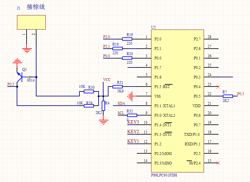 碰到一个设计电路,使用的是LPC931的单片机,其中P1.5和P0.5引脚的连接看不懂,其中使用了几个电阻和三极管。P0.5可作为标准I/O口,也可做模拟比较器的参看电压输入,P1.5只能做复位和输入引脚,三极管基极那边接的J1接的是一个类似开关的元件,闭合连通接地。请大家帮忙分析一下,这个电路的作用是什么?还是电路有什么问题?多谢啦!