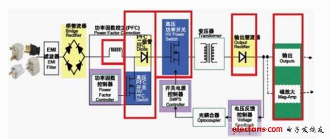 在一个电源设计中,能效规范对电路段的挑战主要体现在PFC能效、主转换器能效和次级能效几个方面。要提高这几个方面的能效,就必须改善如图1所示电路红色框中的元件性能。以下将介绍改善电路段能效的几种方法。