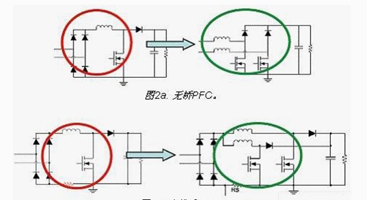 改善PFC能效的目标是为了实现功率因数校正短的效率达到96%以上。采用无桥PFC(图2a)可以减少桥损耗,采用交错式PFC(图2b)可以满足较高功率应用的要求,以提升PFC能效。此外,还可以利用IC技术减少开关损耗,并利用更优化的拓扑结构来减少EMI滤波器损耗。