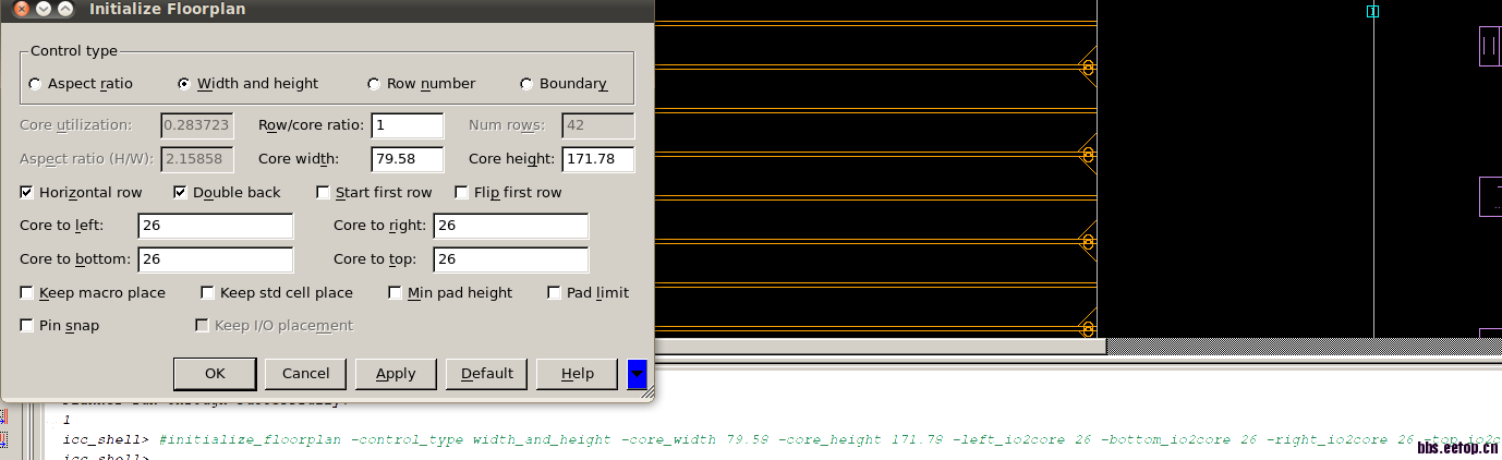 initialize_floorplan -control_type width_and_height -row_core_ratio 1.0 -core_width 80 -core_height 180 -left_io2core 26.0 -bottom_io2core 26.0 -right_io2core 26.0 -top_io2core 26.0