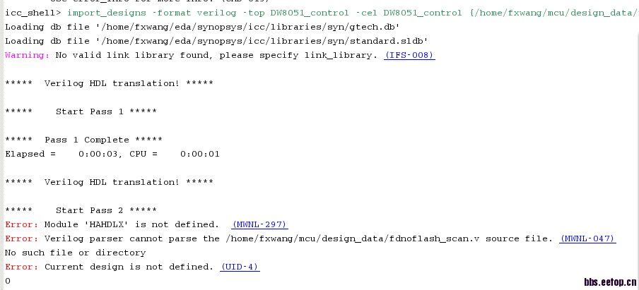 我在icc 中创建完库后读取网表时总是提示: current design 没有定义。read_verilog和import_design两种方法都试了也不行。