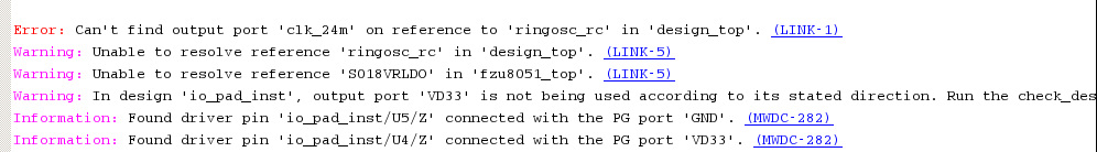4、显示了找不到clk_24m端口的错误,看来下版图上ring_osc的模块上面有这个pin,后来发现网表里面端口名字写错clk,不过将它改成clk_24m错误依然存在,而且飞线显示他没有和其他的标准单元连接。