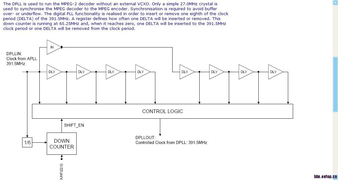 “The DPLL is used to run the MPEG-2 decoder without an external VCXO. Only a simple 27.0MHz crystal is