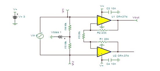 我采用的是TINA 提供的参考设计,因为我对输出信号的要求就是抬升1v,信号放大到0.5~2.5v,