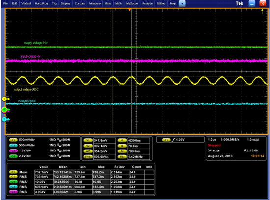When supplier changed to new batch(2013/1/4) which is used for the first time, when input voltage(AIB2) is also 4Vdc, the voltage output(VOLT_ADC) after amp is not stable(yellow), output voltage occurred oscillation ! Freq=1.4MHz, AM=160mV.