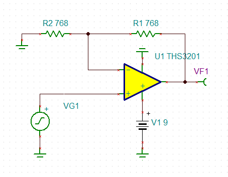 我需要的是一个跟随电路,因为THS3201是电流反馈运放,所以Rf必须要有的,并且我想把同相放大电路的放大倍数设置成1,但是如果直接在Vin-端加一个电阻拉到地的话,放大倍数就不会是1了。