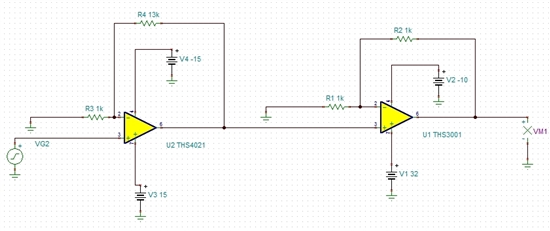 第一级采用运放ths4021,可以将信号放大到10V左右,但是第二级运放很难同时满足带宽要求和输出电压幅值的要求。