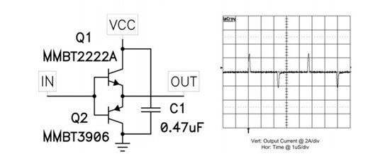 如图2 hfe 曲线所示,通常厂商都不会为这些低电流器件提供高于0.5A 的电流。但是,该电路可提供大大高于 0.5A 的电流驱动,如图 1中的波形所示。就该波形而言,缓冲器由一个 50Ω源驱动,负载为一个与1Ω电阻串联的0.01 uF 电容。该线迹显示了1Ω 电阻两端的电压,因此每段接线柱上的电流为2A。该数字还显示MMBT2222A 可以提供大约3A 的电流,MMBT3906吸收2A 的电流。事实上,晶体管将与其组件进行配对(MMBT3904 用于3906,MMBT2907 用于2222)。这两个不同的配对仅用于比较。这些器件还具有更高的电流和更高的hfe, 如 FMMT618/718 对,其在 6 A 电流时具有100 的hfe(请参见图2)。与集成驱动器不同,分立器件是更低成本的解决方案,且有更高的散热和电流性能。