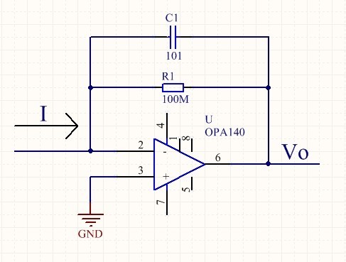 此电路的电流测试范围0~20pA,反馈电阻接的100G,输出接了一级RC滤波,主要滤除运放的噪声,