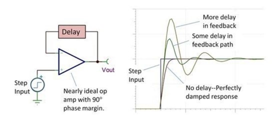 反相输入无法及时接收到其已经达到并传递出正常输出电压的反馈。其将过冲目标并在最终建立时间前需要诸多连续的极性纠正。如果是少量的延迟,可能只是看到了一些过冲和振铃。如果是大量的延迟,那么这些极性纠正就会永无休止——进而形成振荡器。