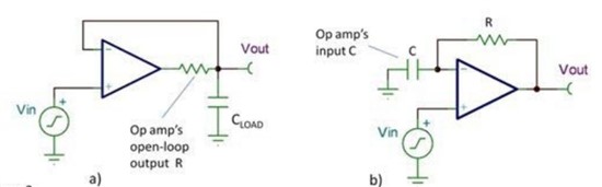 延迟的根源通常是一个简单的低通 R-C 网络。就所有频率而言,这虽然不是一个恒定的延迟,但是该网络从 0° 到 90° 的逐渐相移会产生一个一阶逼近的时延,td=RC。最常见的有两种情况,R-C 网络不经意间就会在我们的电路中形成。第一种情况是容性负载(见图 2a))。电阻就是运算放大器的开环输出电阻,当然电容器就是负载电容了。第二种情况是(请参见图2 b)反馈电阻和运算放大器的输入电容形成了 R-C 网络。在这个敏感的电路节点电路板连接也是电容的重要因素。请注意这两个电路具有相同的反馈环路,唯一不同的是输出的节点不同。从环路稳定性的角度来说,他们会产生同样的问题。延迟反馈的这两个因素通常都会起作用——如果两个因素同时作用的话会带来更大的麻烦。