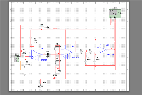 Windows xp系统,Multisim13仿真软件,Vpp为2V,50Hz的正弦交流信号加上了2V直流偏置,输入到op07电压跟随器上,出现电压失真,相同配件情况下将OP07CP换成OPA2277U则输出正确,请问是什么原因?
