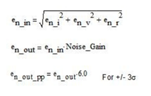 运放噪声的计算就是将这三个值一一求出来,由于这些噪声是不相关的。它们的矢量和即为运放的总输入噪声。再乘上噪声增益就可以得到输出端噪声,公式如下。看似简单实则很麻烦。