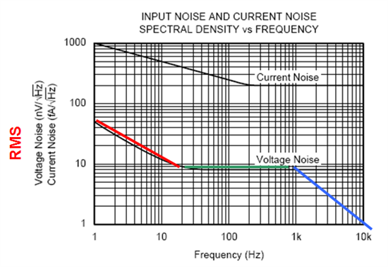 看上去好麻烦,不要急,还有更麻烦的事,就是运放的输入电压噪声和输入电流噪声,是与频率有关的,在极低频率时(0.1Hz-10Hz)主要是1/f噪声,以后主要是白噪声,如下图,