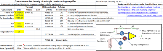 卖了半天关子,下面隆重推荐由Bruce, Trump刚刚设计完成的一个运放电路噪声计算器。就是一个excel表,可以在下面的页面中下到。