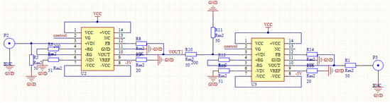 更正一下,我后面原理图有做修改,第一级vca的RF电阻值改为1k,第二级不变。vout1在R10右边而不是在左边。