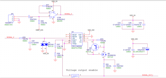外部信号交流耦合做高通滤波后进入运放做跟随,然后连接到XTR111的信号输入端。