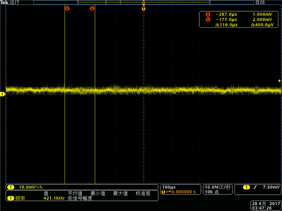 没有输入(输入端子正负短接),XTR111的输出接250欧电阻的波形,且短接开关S3或短接输入交流耦合电容C27时的波形: