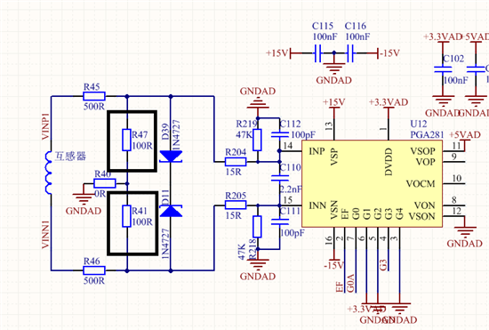 如图:R41,R47两个电阻越小越PGA281输出越接近理论值(可是这2个电阻太小会让我原信号失真)。我看资料PGA281明明支持完全差分信号,难道实际只支持单端输入信号?