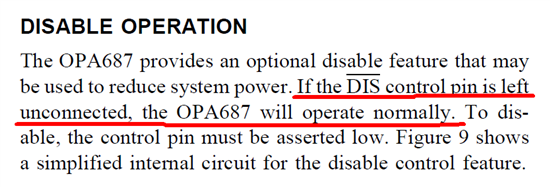 有这个引脚是为了当器件不用的时候,dis引脚使能,OPA687 进入低功耗状态。