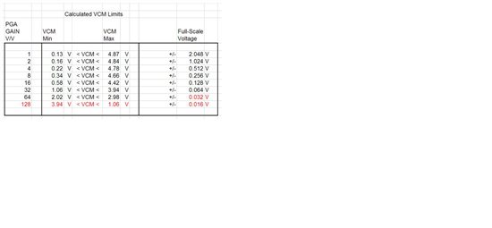 In this example, since the maximum expected differential signal is 14mV; the user may use Gain=128 without exceeding the +/-16mV full-scale voltage. In addition, in this example, the common-mode voltage of 7mV is inside the allowed common-mode range for all PGA Gain cases.