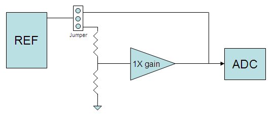 1. 具体的Jumper用法见下图。你可以通过改变分压电阻获得你想要的基准电压,运放只是buffer一下。如果改变基准电压这条路走不通,你还可以用jumper把ADC的REF输入口接到基准芯片的输出。