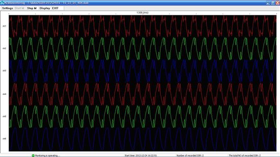 如果PGA为8倍以上时,信号变为正常,以下波形有6个通道,从1ch到6ch(通道),PGA分别为1倍,2倍,4倍,8倍,16倍,32倍。1ch到6ch输入为同一个差分的正玄波信号。见下图:
