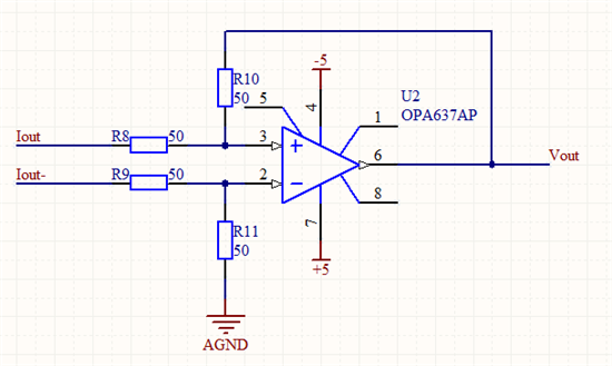 在Iout输出端口后面应该先加50Ω电阻到地,将电流信号转化为电压,再接入差分放大器。