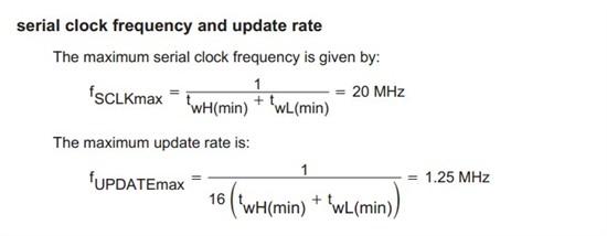 20M是SPI的最大时钟速率,16个SCLK打进去一个DA的16位数据,DA的最大工作速率是1.25M。你说的fclk是400K,芯片能正确转化,是速度高了输出就会混乱?怀疑是两个原因