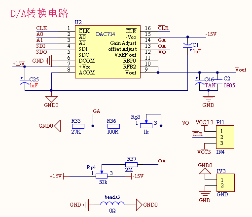DAC714,TI的一款16位DA,可以输出正负10V,但是无论怎么都不能输出负的,也不知道是不是电路图接错了
