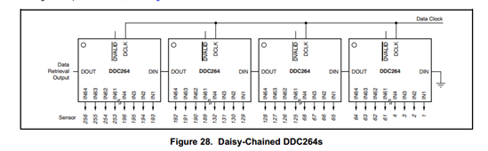 连接成菊花链的状况下,在写完配置寄存器后,在DCLK给320个时钟信号,然后第一个DDC264的配置就输出了,接着在给320个时钟信号,接着就输出了第二个DDC的配置,以此类推。 这个类似于数据手册图 29的时序,只不过输出的是配置信息,而且读出两个配置之间需要给320个时钟信号。