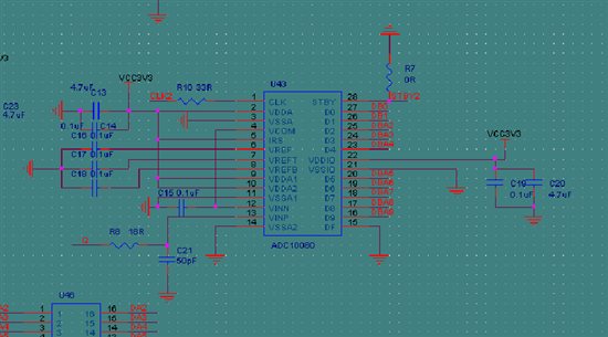 最近准备用ADC10065做采样,PCB板上做了两路ADC,两路ADC的电路完全相同,ADC电路原理图为按照数据手册上单端信号输入的原理图,测试的时候发现用了一段时间后VREF,VCOM, VREFT, VREFB三个引脚的电压不对,正常电压值分别是1.19,1.46V,0.94V,1.97V。工作一段时间(很短)后,这些引脚的电压值会不对,不正常的电压值依次为:2.43V,0.38V,2.41V,2.55V。有时候过一段时间后这些电压值又会变得正常。