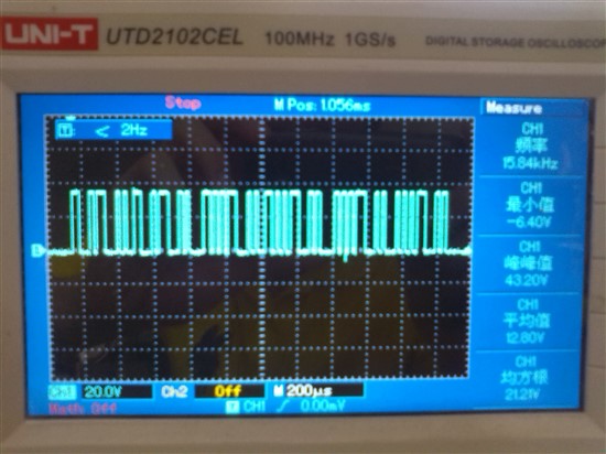 3.但检测 ADS1118 的 DOUT 引脚时却出现这样的波形,不论有没有模拟量输入都是的波形,如下图,这我就费解了...