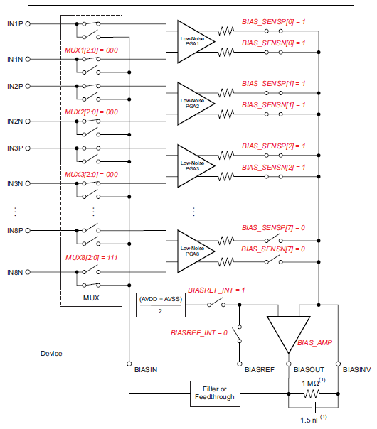 2.不通过额外电极连接到人体,从Biasout端接出,通过阻容元件进入Biasin端,如下图所示,以1,2,3端为bias drive signal,消除IN8N端的共模干扰。