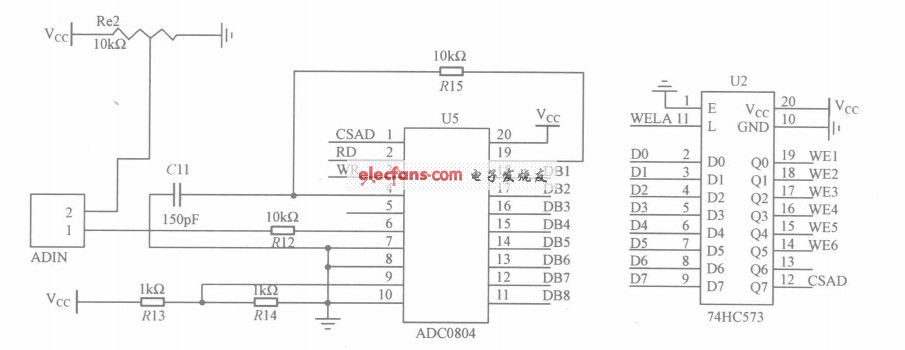 左边的是ADC0804,右边的是74HC573锁存器,锁存器同时又连接了单片机没画出。ADC0804的引脚CSAD是片选引脚,因为是低电平有效所以当