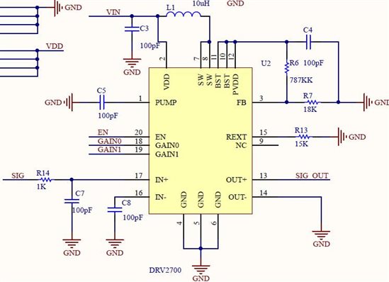 如图所示,我参考数据手册设计的电路,使用MCU控制EN和放大倍数,但一旦上电后,DRV2700的温度飙升很烫,而且输出也没有放大。请问各位高手有什么建议或者解决方法吗?