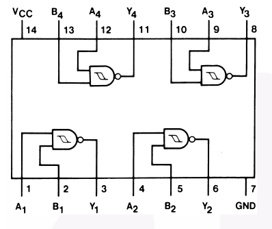 1 4 10 13引脚是输出。偶尔也能找到 3 4 10 11引脚作输出的型号,但是没有和与非门一样是3 6 8 11引脚输出的封装。