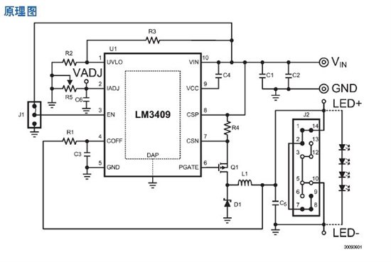 在datasheet: www.ti.com.cn/.../lm3409.pdf 第十八页有一个设计案例,将您的参数代入其中,推算出合适的R1,R4,L1即可。