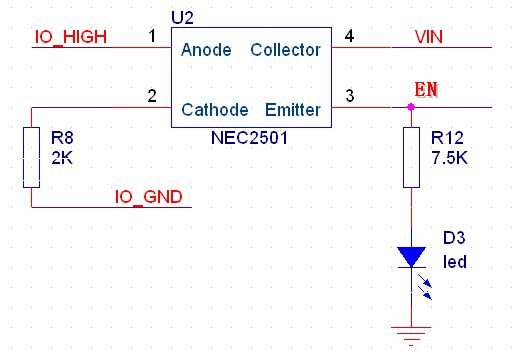 你好,如上图所示,我是利用光耦NEC2501来控制LM3409的关断。VIN为输入电压(12V)。理论情况下,IO口为高时,光耦3、4脚导通,即LM3409的EN为高,LM3409工作。IO口为低时,光耦3、4脚不导通,即LM3409的EN为为悬空,LM3409不工作。