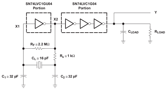 另外建议自己搭建皮尔斯振荡器时建议使用下图电路,多加几个反相器增强负载驱动能力,你也可以直接使用SN74LVC1GX04,专门用于石英晶体振荡器的。