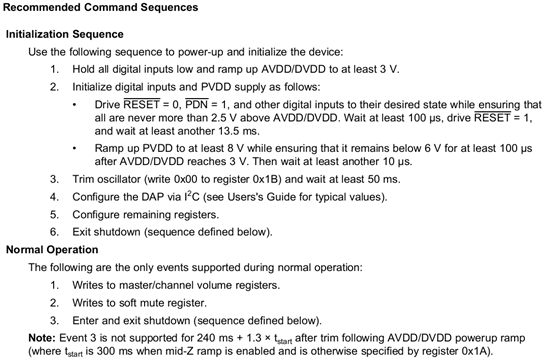 "第六脚SStimer电压没有3.3V,另外功放A,B,C,D四通道上反馈回去的信号BST 脚位上的电压只有输入电压一半。"说明芯片还处于Shutdown状态。你们程序里面对TAS5711做了哪些初始化配置?