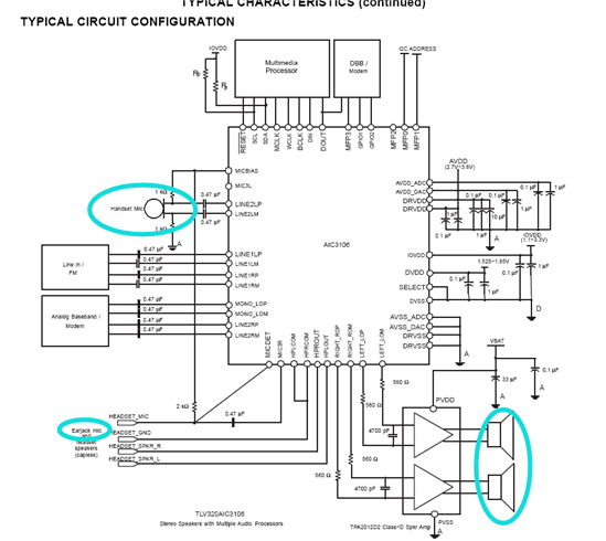 TLV320AIC3106按手册中的参考图Figure 13.设计,MIC输入有handset MIC和Earjack MIC 2种通道,音频输出有耳机和扬声器2种