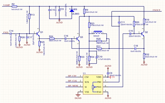 你们说得都对!可能我表述得不够清晰,我还是把电路图贴出来吧。这是一个比较经典的效果处理电路,实现的是可控带通滤波。