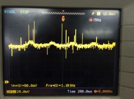 如下,从波形上看是一连串的窄脉冲,幅值在几十毫伏之内。接到音箱上听到的是类似拉拉链的声音。