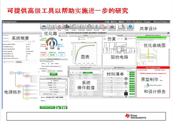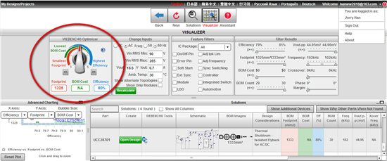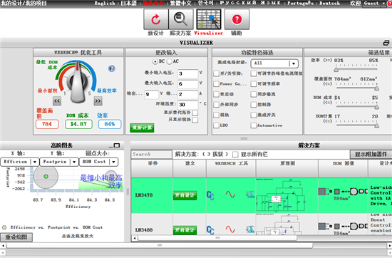 所有这些设计工具皆可通过 WEBENCH Visualizer 接口向用户提供多个不同的完整系统选择 (一目了然的数值比较!) 设计工程人员可微调设计结果,而且可通过 WEBENCH 优化旋钮.得出大小、效率和系统成本的最有效算法。