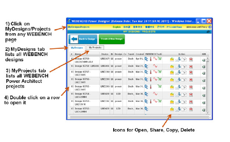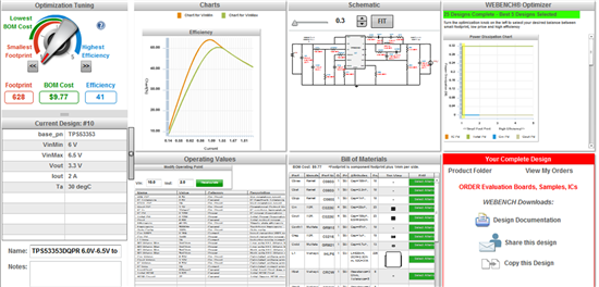 WEBENCH® Power Designer 的所有高级工具皆可用于针对您的设计提出问题。这样,用户就能使用 WEBENCH 的各项功能,如查看和变更 BOM、查看关键性的操作数值(例如效率和负载电流)、实施电气仿真、进行热仿真(假如可用)并运用 WEBENCH Build It 功能(倘若可用)获得原型制作套件。