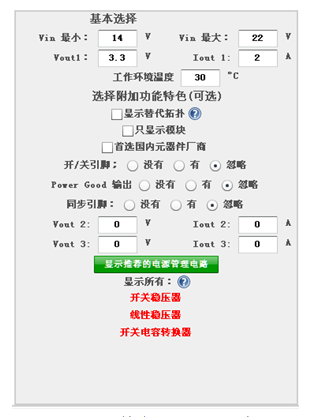 链接地址为:http://webench.ti.com/webench5/power/webench5.cgi?lang_chosen=zh_CN&VinMin=4.5&VinMax=5.5&O1V=3.3&O1I=6&op_TA=30
