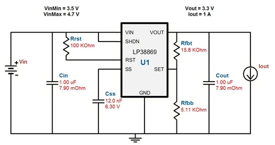 LP38869完全能够满足这个系统的设计要求,使用WEBENCH,仅仅通过简单的几步就得到了所需的方案,包括方案原理图、材料清单、成本预算以及性能分析,可以说,TI为工程师提供了最大程度的便利。