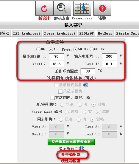 •有两种方法进入单电源设计界面。第一种方法是在电源选型页面选择“visualizer”进入电源设计,第二种方法是回到开始界面,选择“power”,输入电源的设计条件,按绿色按钮进入电源设计界面。