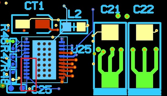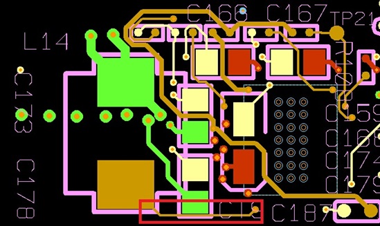 电容C21和C22采用的是三洋的4TPF470ML,470UF的钽电容。图中各引脚红色的是12V,黄色是数字地,绿色是输出的1.0V。红色框里是芯片的输出端LL node,我发现这里有较大问题,引脚扇出不够且走线过细,不知道这里会不会导致输出电压拉不起来?